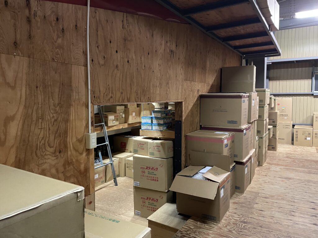 倉庫を見回して、あらためて思います。まだまだあります。写真の通り、足元にも棚の上にも段ボールが並び、開封した箱の中にも商品がきちんと残っています。ひとつひとつは普通の箱でも、集まると「量」としての存在…