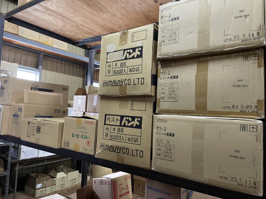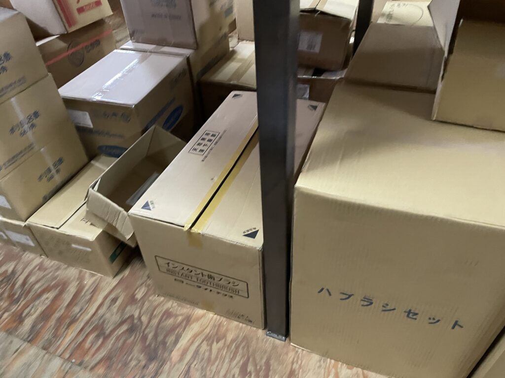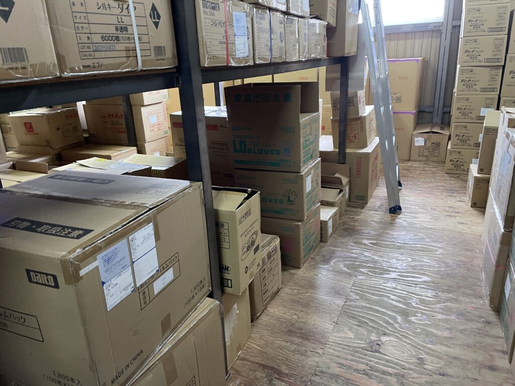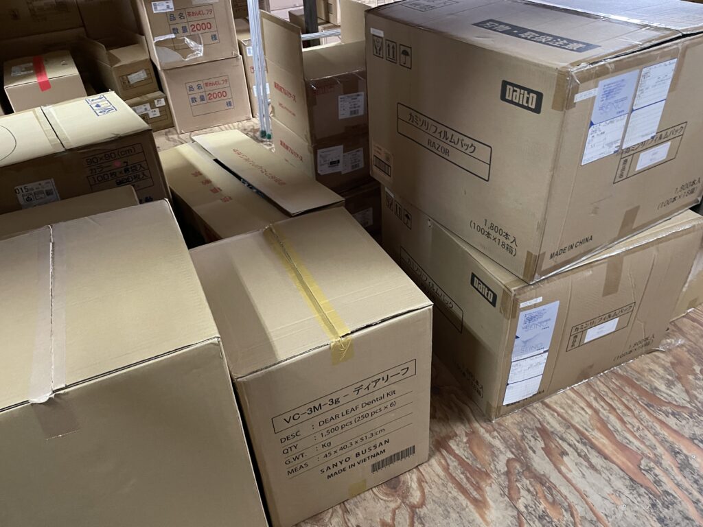 倉庫を見回すと、思わず声が出ます。「いっぱい在庫ありまーす」。写真の通り、段ボールがきれいに積まれていて、ハブラシセットやデンタル用品など、まだまだしっかり揃っています。