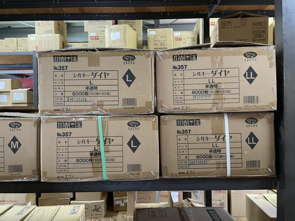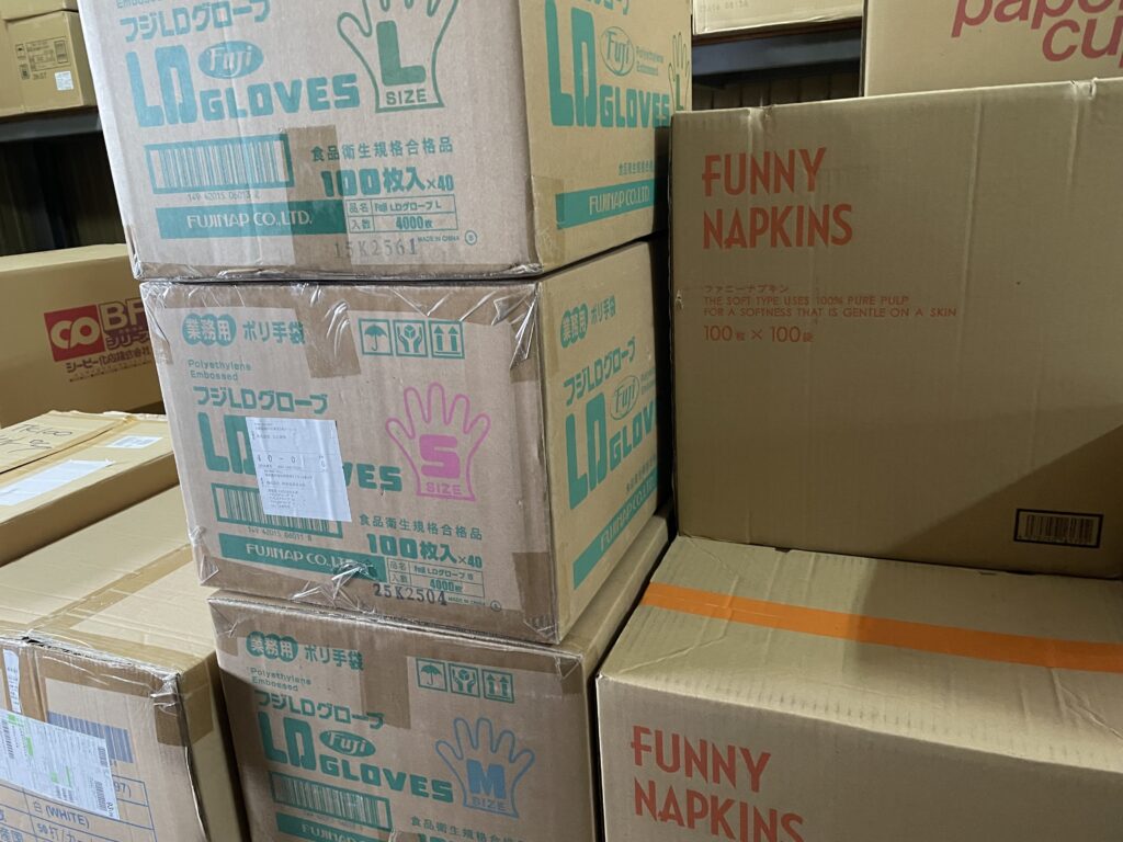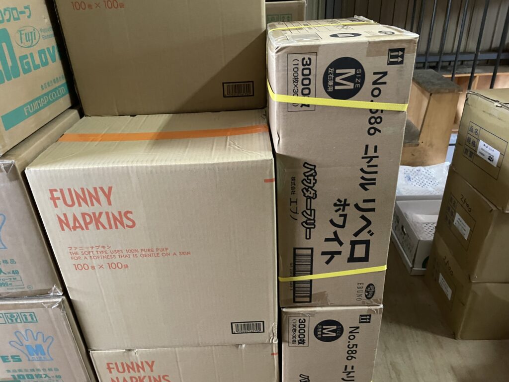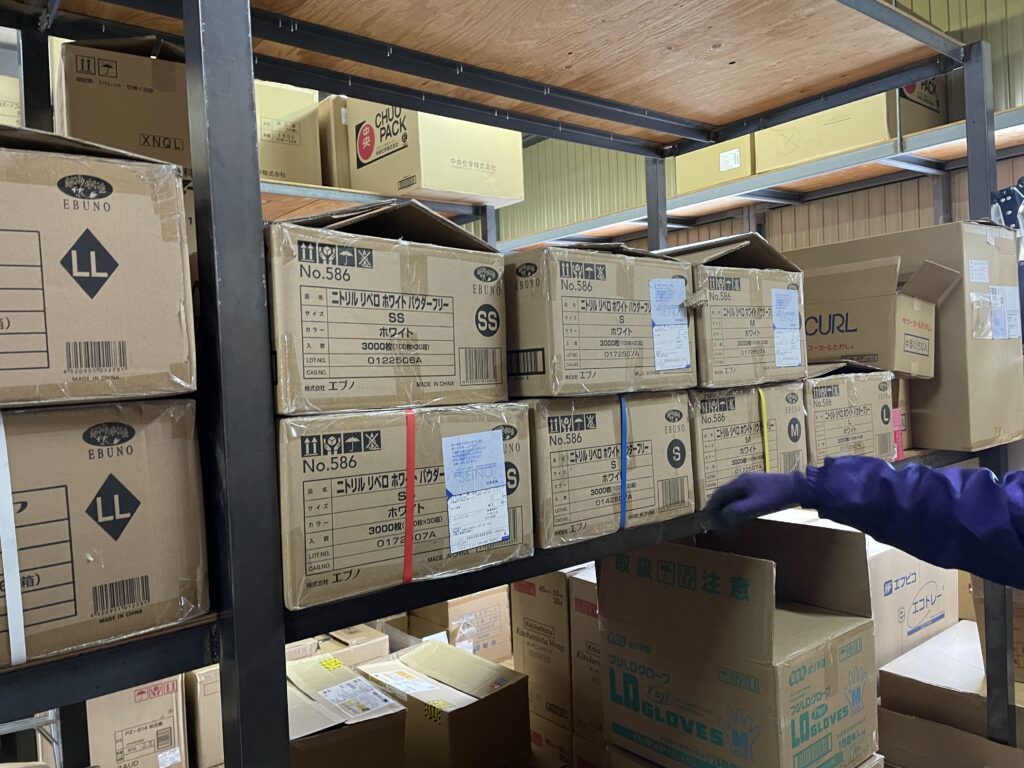 倉庫を見回すと、思わず声が出ます。「いっぱい在庫ありまーす」。写真の通り、段ボールがきれいに積まれていて、ハブラシセットやデンタル用品など、まだまだしっかり揃っています。