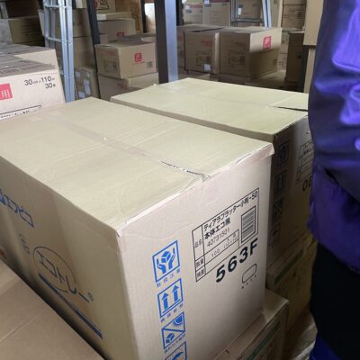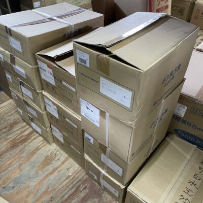 倉庫を見回すと、思わず声が出ます。「いっぱい在庫ありまーす」。写真の通り、段ボールがきれいに積まれていて、ハブラシセットやデンタル用品など、まだまだしっかり揃っています。こういう“現場の量感”は、数字…